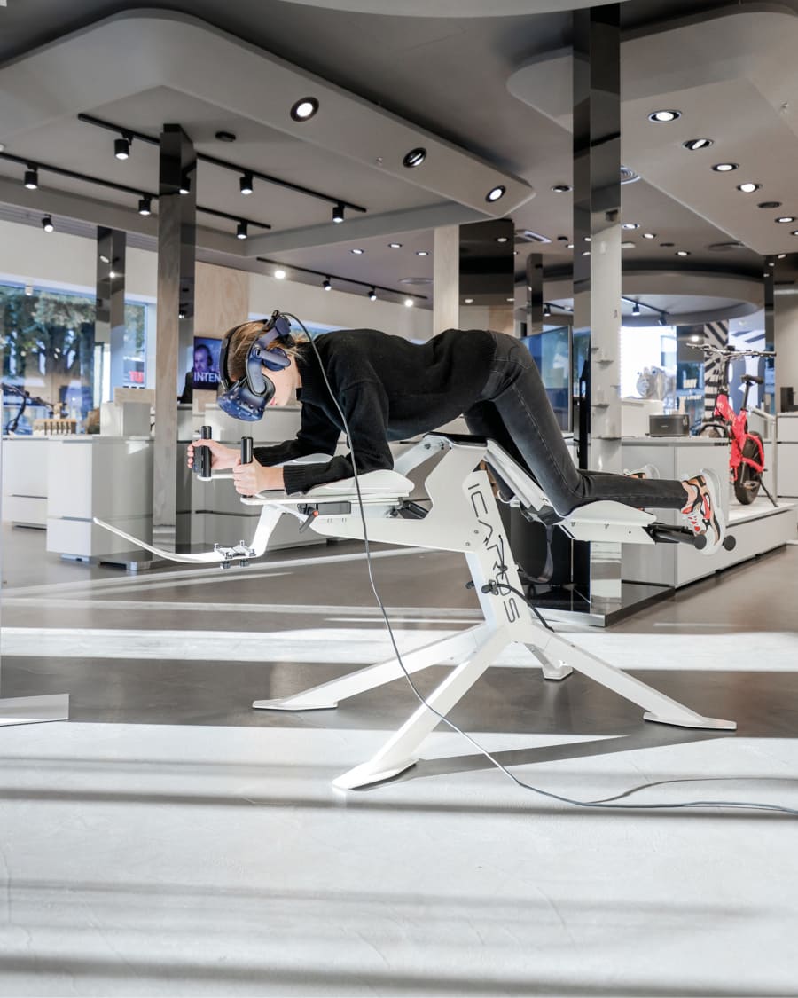 Icaros is a gyroscopic device that the player lies in a horizontal position to control the movement. The pilot is using balance, coordination, core muscle tension and reaction to steer through three dimensional virtual worlds. . You can either fly over mountains, challenge your opponents in to a air races and shoot down drones, dive with sea creatures, protect the reef from evil submarines or jump out of an orbiting satellite to Earth.