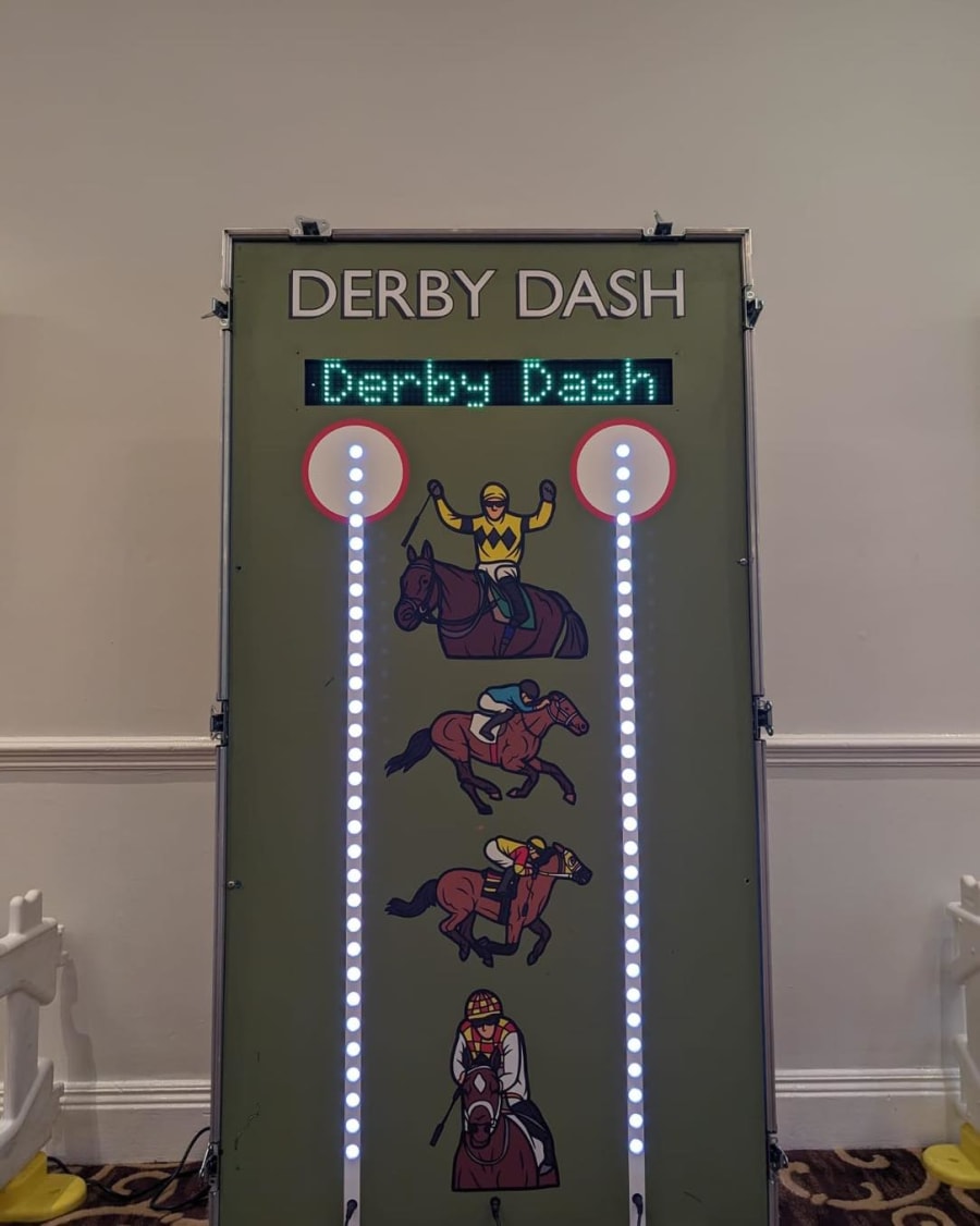 Get ready for a day filled with heart-pounding excitement and friendly competition with the Derby Race Horse Racing Game! Perfect for events like company parties, marketing events, festivals, and school or college events, this two-player game will have you and your teammate at the edge of your seats.