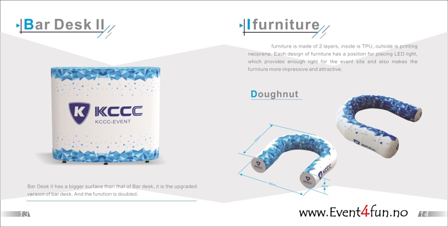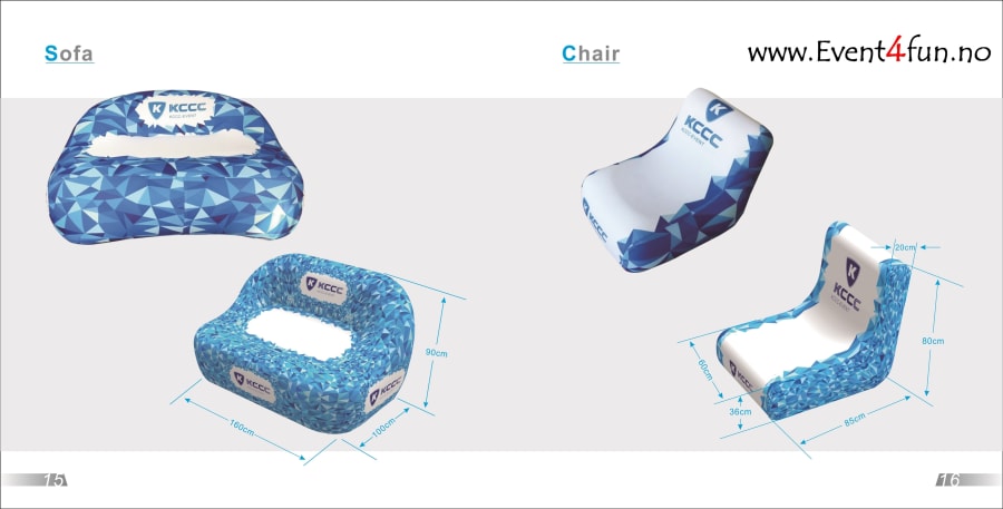 Tilpass oppblåsbare møbler for å reflektere merket ditt. Mulighetene for å tilpasse oppblåsbare møbler er uendelige: store logoer, mønstre, bilder på hele overflaten av våre produkter. Våre sublimerte polyesterdeksler er laget for å måle for hver kunde innen 15 dager. Vi tilbyr en gratis 3D-simuleringstjeneste som gjør det mulig for våre kunder å visualisere modellene deres før de kjøpes, slik at de får en optimal rendering og servicekvalitet.