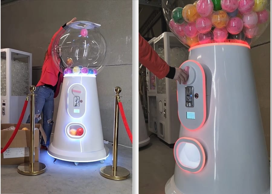 Our giant gumball type dispenser work best with 100 mm to 120mm diameter balls and you can Put any prizes, give aways you want inside of our capsules