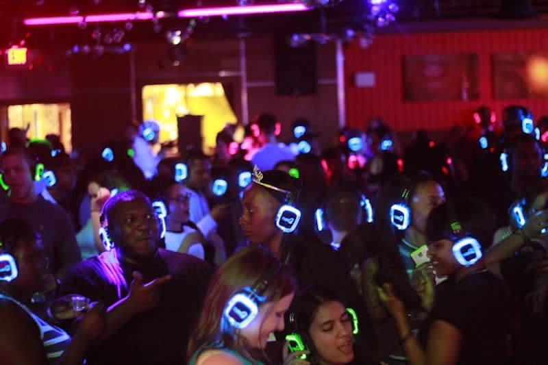 La partiet folk velge hvilke DJ de ønsker å lytte til via en bryter på sine hodetelefoner.