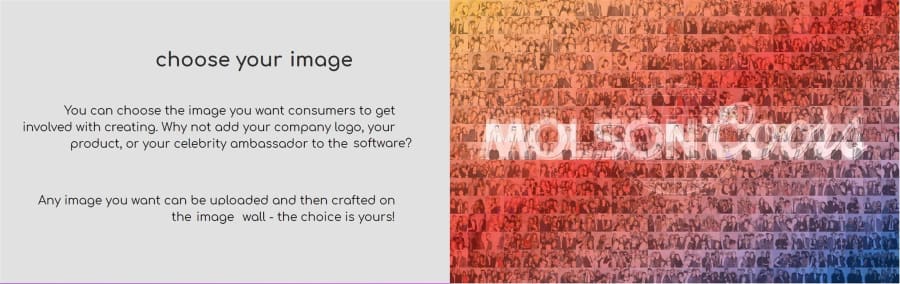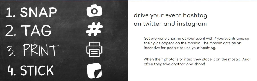 Mosaic photo wall - Mosaikk bilde vegg programvare lager digitalt og fysisk bilde fra live events-bilder i sanntid. Eventfotografiene hentes automatisk fra twitter, Instagram eller våre fotoboder på stedet, eller et fotografekamera på stedet. Bilde etter tall får alle til å føle seg som når du ser på det store bildet, vi er alle sammen. Fra nært hold ser du individuelle bilder - lenger bak ser du at det større bildet blir avslørt. I et ‘fysisk oppsett’: Den automatisk skriver ut bilder som klistremerker. Gjestene kan delta i den interaktive opplevelsen ved å plassere fotoklistremerker på det store brettet. I et ‘digitalt oppsett’: Prosessen projiseres eller vises på en stor TV-skjerm.