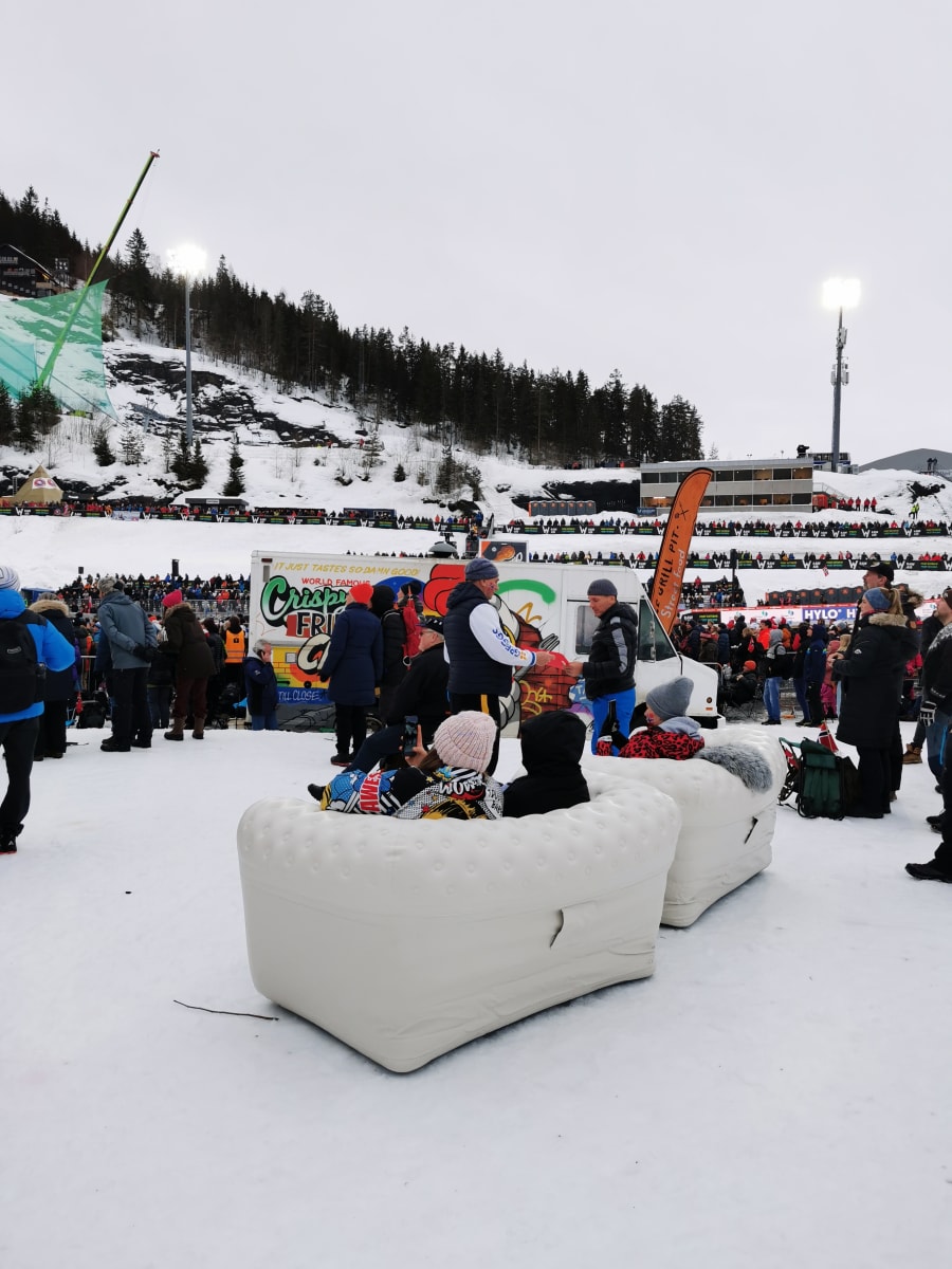 Hvorfor ikke leie stilige oppblåsbare sofaer i stil med den tradisjonelle chesterfield? Disse sofaene er perfekte for en hagefest, firmafest eller som møbler på en utstillingsstand eller for et backstage-område. Sofaen blåses opp på et par minutter ved hjelp av en elektrisk pumpe.