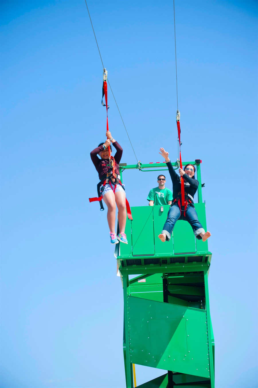 Riders are fitted with a harness and helmet before climbing the staircase to the Launch Platform 8 m off the ground. Once on the Launch Platform the rider waits for their turn in the safety of the Launch area, this is where they are attached to the line. When the rider has completed the safety checks the operator will rotate the Launch area into position, and the rider launches off… And suddenly they are flying towards our inflatable target!