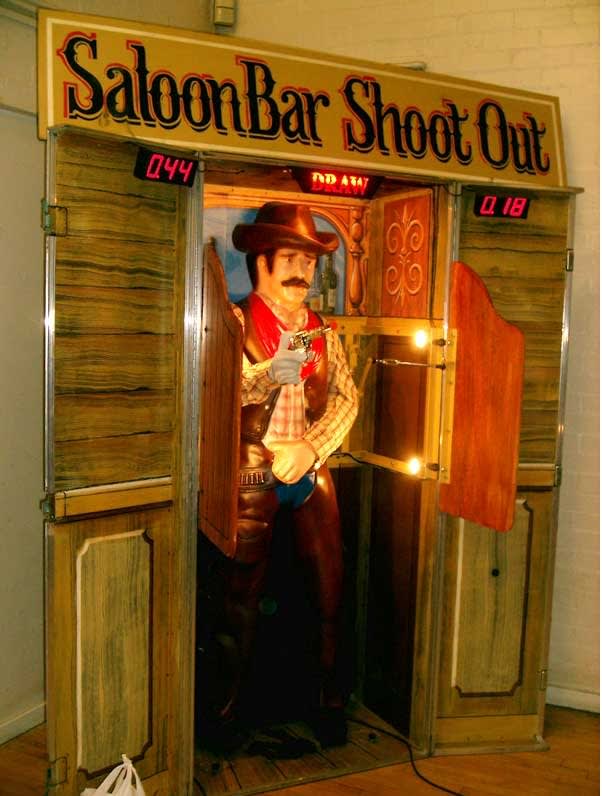 Are you ready to test your reaction time against our full size cowboy quick draw? Our Saloon Bar Shootout features an illuminated bar themed cabinet, swinging saloon doors, as well as a 3D fiberglass cowboy complete with robotic arm movement. Wild West gun fire, honky tonk piano music, and even the world famous funeral march music which only adds to the authenticity of this amazing quick draw game.