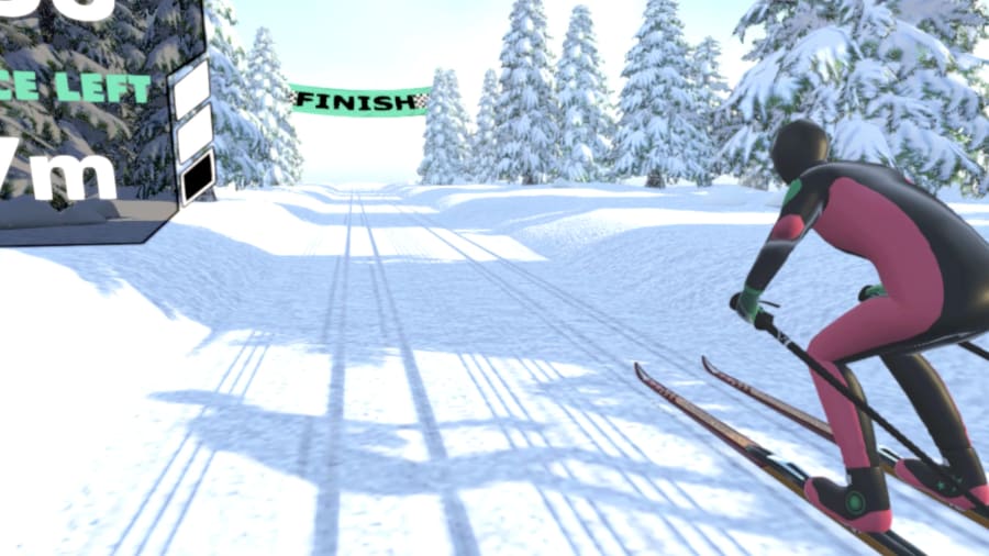 Welcome to Cross Country Skiing VR! Your task is to finish before your opponent in a virtual, cross country skiing race. But watch out! You're ski poles are very short so squat down and really get moving with your arms to get a head start and cross the finish line first. You choose if you want to face off your opponent in a 500 or a 1 000 meter track. Get your heart rate going in the snowy, virtual forest tracks!