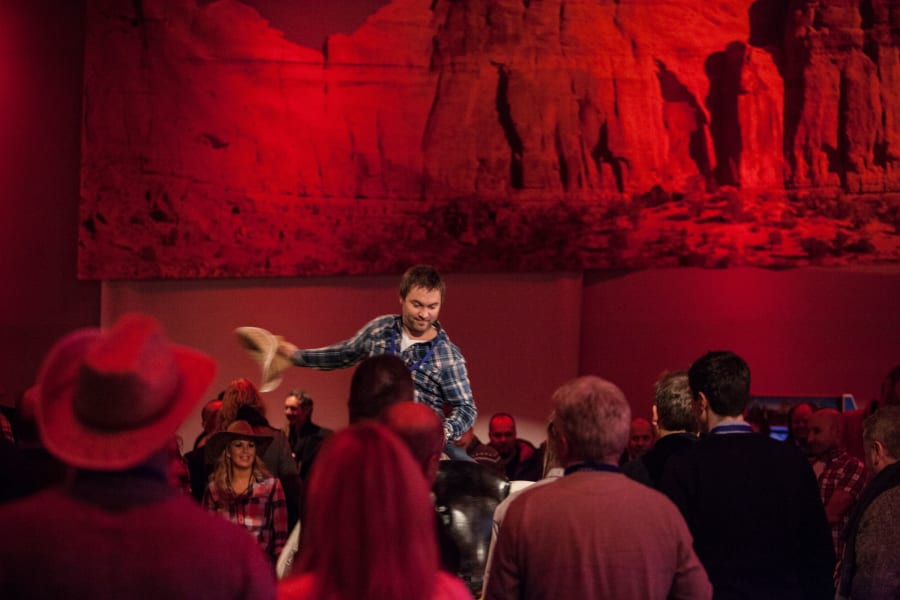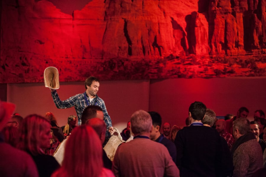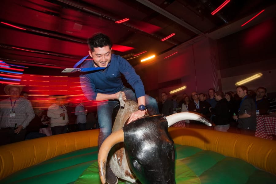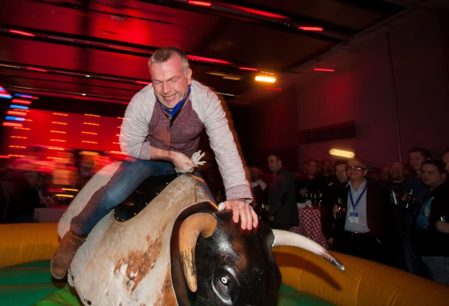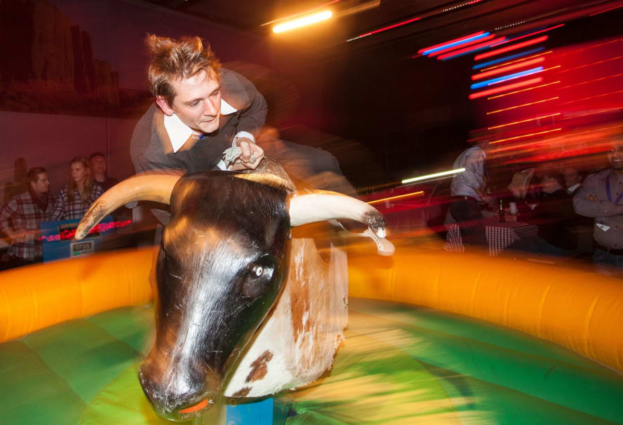 As you arrive and enter into the main function room you will be offered a drink from the shot bar and serenaded by the strains of the Honky Tonk pianist in the corner. Upon taking a wander outside you will see all the entertainment that conjures up an image of being at a Rodeo. The Rodeo bull, Coconut Shy, John Wayne Quick Draw, Milking Cows and Adult Striker will all be set up on the grass outside with a shot bar in the corner of the patio providing the initial drinks. This area is open right through until Midnight, giving everyone a chance to try all the different side shows and competitions. Once the Hog Roast is underway and you have all had your share of Alabama Fudge Cake the disco starts to play some country & western style background music to get everyone in the mood.